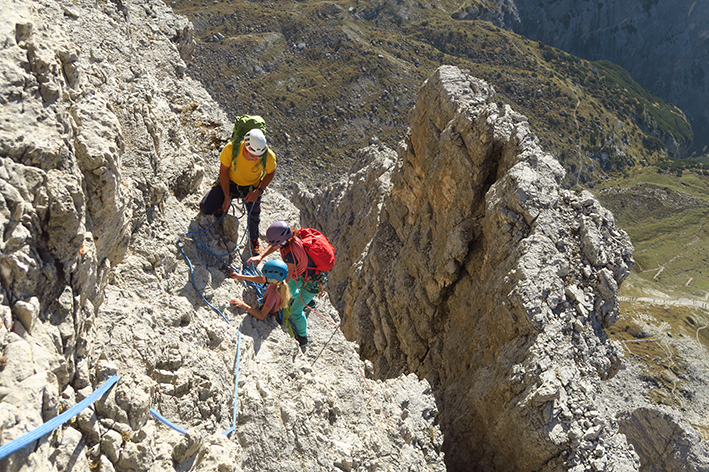 Der Ausgangspunkt für diese Klettertour auf die Große Zinne ist der Parkplatz an der Auronzo Hütte oberhalb von Misurina. Zunächst geht es ein kurzes Stück unterhalb der Südflanken der Drei Zinnen entlang, bis wir über einen Steig im Zickzack über die Geröllfelder in ca.50 Min. zum Einstieg, zwischen der Kleinen und der Großen Zinne gelangen. Hier seilen wir uns an und es beginnt die Klettertour die uns in 3 bis 4 Stunden auf den Gipfel führt. Über die Einstiegsrampe und eine Kaminrinne gelangen wir auf das untere Schuttband. Immer wieder wechselt Gehgelände mit einfachen Kletterpassagen und tollen Aus- und Tiefblicken in einer beeindruckenden Landschaft. Die Schlüsselstelle befindet sich in einem Kamin im oberen Bereich der Tour. Ist diese überwunden, geht es noch drei Seillängen weiter und wir gelangen auf das große Ringband. Nun queren wir entlang des Bandes bis wir an einer geeigneten Passage die letzten Klettermeter in Angriff nehmen. Bald stehen wir auf dem Gipfel und können den grandiosen Rundblick genießen. Nach einer gemütlicher Gipfelrast geht es über den gleichen Weg ab kletternd und abseilend zurück zur Auronzo Hütte.